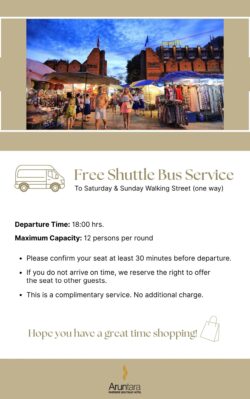 Aruntara Riverside Boutique Hotel invites you to enjoy a truly special shopping experience with our complimentary shuttle bus service to Chiang Maiโs most vibrant weekend walking streets. Discover unique local products and indulge in a wide variety of delicious street food. ๐๐ฎ๐ ๐๐๐ข ๐๐๐ฅ๐ค๐ข๐ง๐ ๐๐ญ๐ซ๐๐๐ญ (Every Saturday): Departure from the hotel at 5:30 PM ๐๐ก๐ […]