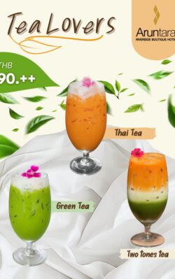 Indulge in 3 refreshing tea creations at Tara Restaurant Classic Thai TeaRich Green TeaStylish Two-Tone Tea (Thai + Green) Only THB 90++ per glass!Open daily from 06.30 โ 23.00 hrs. ย
